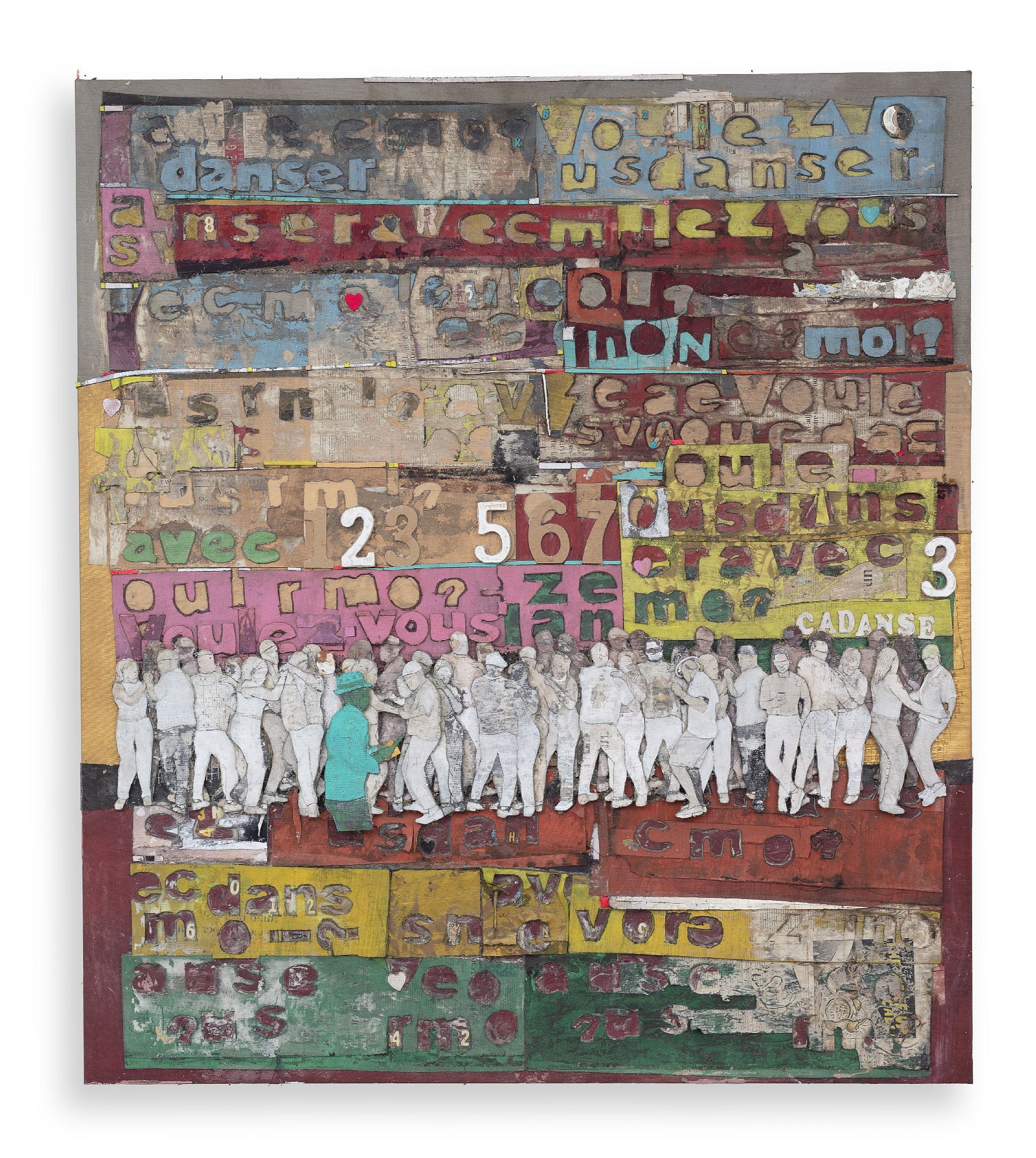CHALK PAINT, ACRYLIC AND NEWSPAPER INK ON CANVAS, 68 7/8 x 61 in. (175 x 155 cm)